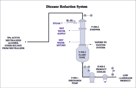 As an alternative to minimizing the formation of 1,4-dioxane, Chemithon recommends the production of 70% AI sodium lauryl ether sulfate followed by stripping of the 1,4-dioxane from the 70% active paste in the Dioxane Reduction System (DRS). The DRS enables a sulfation plant to operate the sulfonation plant at a higher capacity (higher gas concentration) without the usual increase in 1,4-dioxane levels in the final product.The Dioxane Reduction System (DRS) is designed to reduce, by a factor of 8 (1-stage maximum), the 1,4